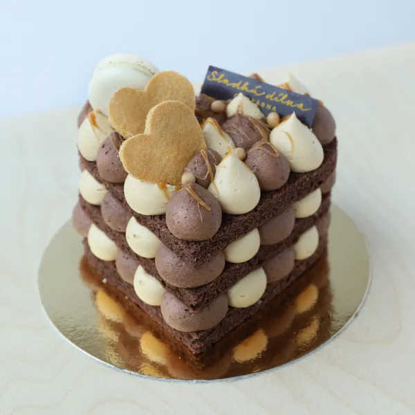Obdarujte své milované nadýchaným srdíčkem. Vláčný čokoládový korpus, na který přijdou dva druhy kuliček. Tmavé jsou z krému ze šlehačky a hořké čokolády a do světlých pak přidáváme náš slaný karamel. Dort má 2 až tři porce.