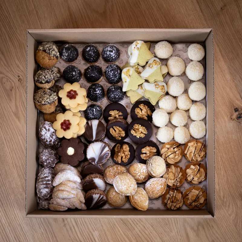 Dali jsme pro vás dohromady ty nejlepší druhy cukroví, které známe, aby vám na štědrovečerní tabuli nic nechybělo. V krabičce je celkem 12 druhů cukroví, od klasických křehoučkých vanilkových rohlíčků až po netradiční pistáciové zvonečky. Pečení tedy letos nechte klidně na nás. :) Druhy cukroví jsou v rámci krabice pevně dané, pokud máte rádi jen některé druhy, můžete si je objednat i samostatně.